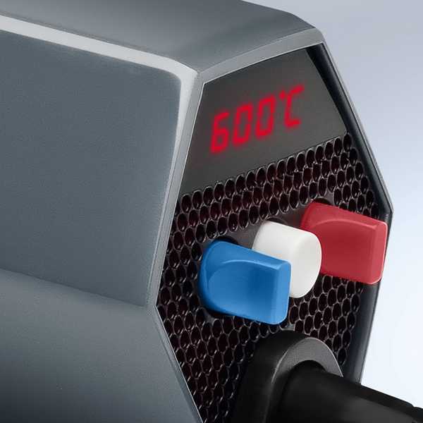 Профессиональный термофен Steinel HG 5000 E выполнен по прямому типу для более эффективной работы и имеет массивный монолитный корпус. Оснащен бесщеточным мотором, отличающимся надежностью и увеличенным до 20000 часов работы ресурсом. Кроме этого он обеспечивает повышенную производительность 215-800 л/мин. Температура и поток воздуха регулируются удобными переключателями на торцевой поверхности. Там же располагается LED-дисплей, отображающий заданную и текущую температуру.