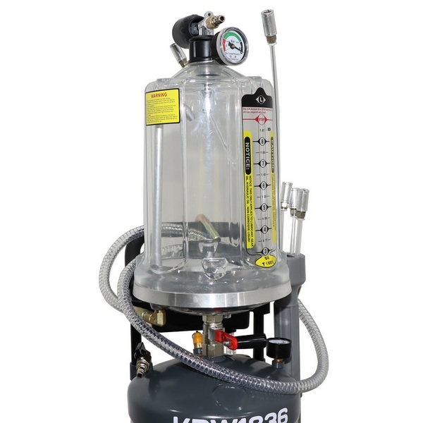 Мобильная пневматическая установка KraftWell KRW1836 с резервуаром объемом 30 литров, дополнительной мерной ёмкостью и 6 щупами различной длины и материала предназначена для откачки моторного и трансмиссионного масел, а также антифриза при проведении технического обслуживания и ремонта в автосервисе, мастерской, на СТО.