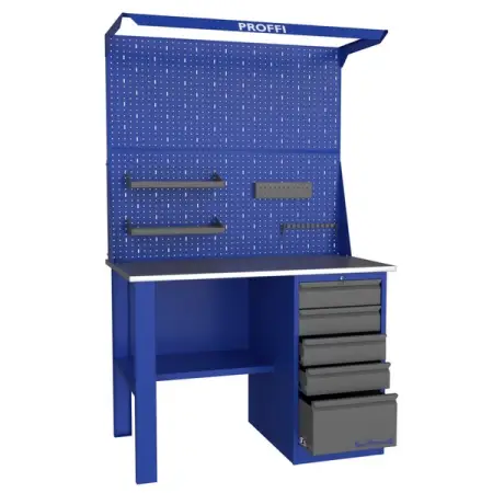 Верстак с перфорированным экраном и подсветкой Верстакофф PROFFI-112 Д5 Э2 применяется в автосервисах, авторемонтных и других производственных помещениях для проведения сборочных операций, обработки деталей и прочих слесарных работ с использованием инструментов и приспособлений.