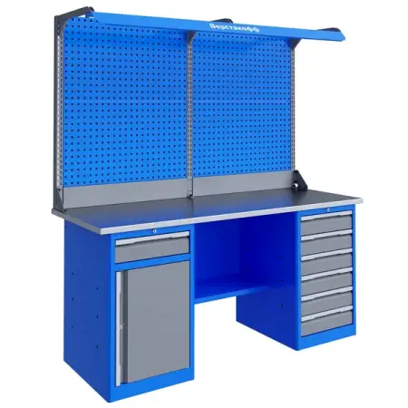 - данный верстак укомплектован стальным и окрашенным порошковой краской двойным экраном с квадратной перфорацией 12х12 мм с шагом 38 мм для установки крючков, держателей и других аксессуаров (опции), а также набором светодиодного освещения рабочей зоны с отдельными кронштейнами;