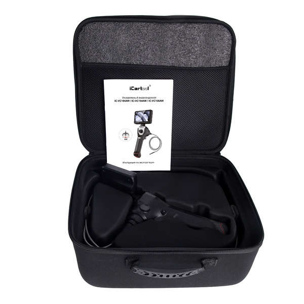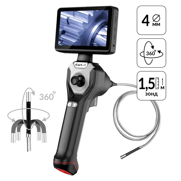 Промышленный видеоэндоскоп профессиональной линейки iCartool со встроенным дисплеем и механизмом всесторонней артикуляции зонда на 360 градусов предназначен для инспекции труднодоступных мест и внутренних полостей в конструкции автотранспортных средств, машинного оборудования, трубопроводов, систем вентиляции и т.д.